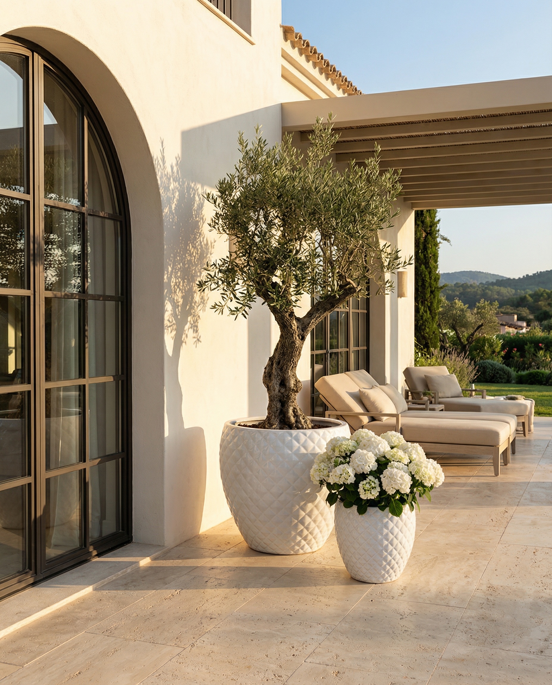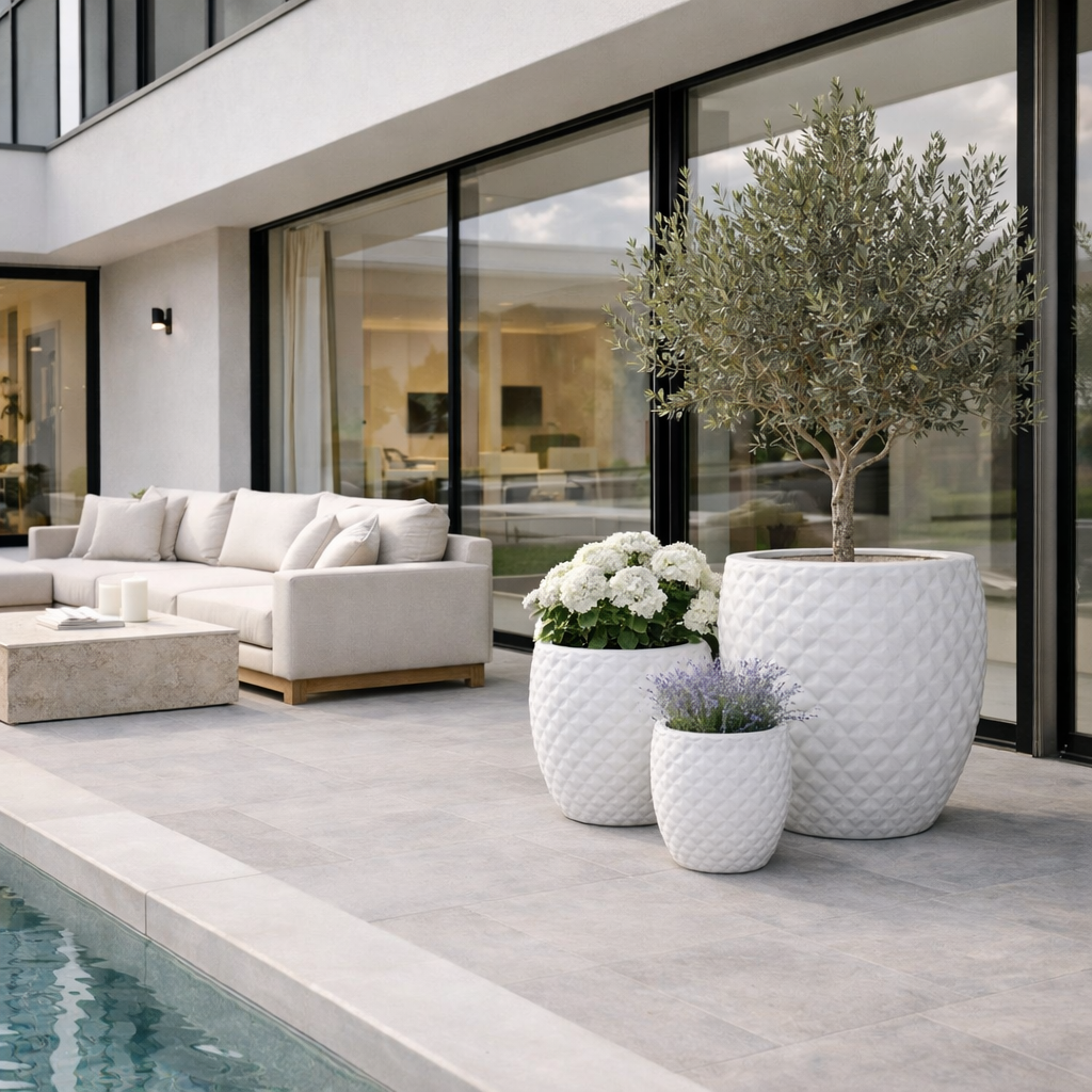 Dzięki dostępności kilku rozmiarów donica umożliwia tworzenie spójnych, wielopoziomowych kompozycji, które podkreślają charakter przestrzeni i nadają jej harmonii oraz elegancji.