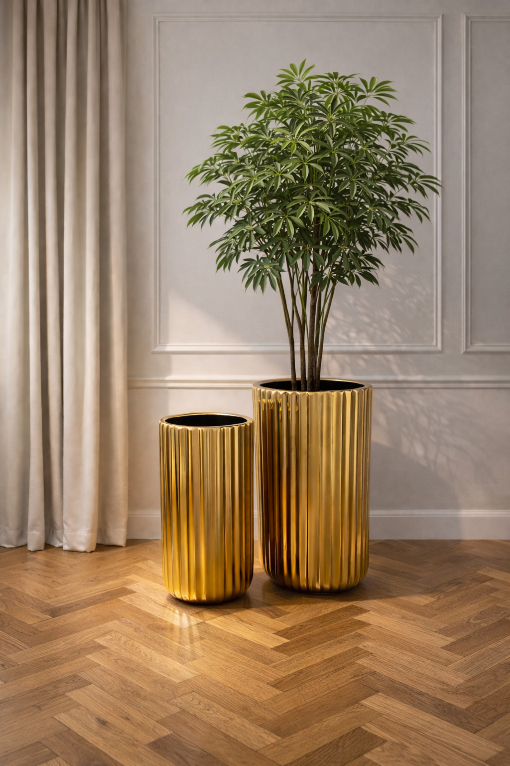 Wybierając zestaw złotych wysokich donic ryflowanych, inwestujesz nie tylko w funkcjonalność i trwałość, ale przede wszystkim w estetykę, która odmieni każdą przestrzeń. Dodasz wyrafinowanego charakteru i osobistego stylu. Warto wzbogacić swoje otoczenie roślinami, ponieważ naturalne elementy poprawiają nasze samopoczucie i stanowią urokliwy akcent. Do tego zestawu donic możesz wybrać na przykład pachirę, dracenę, palmę.
